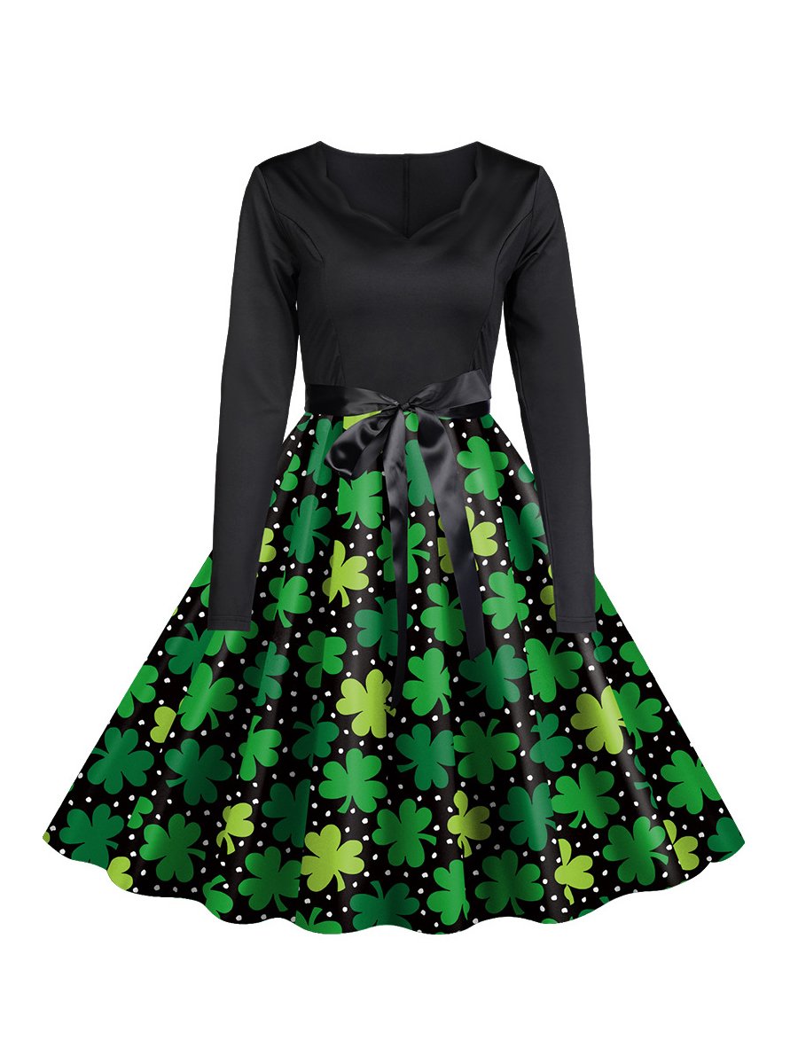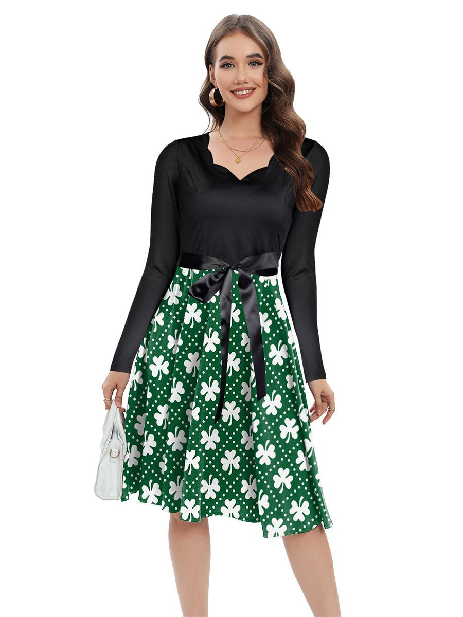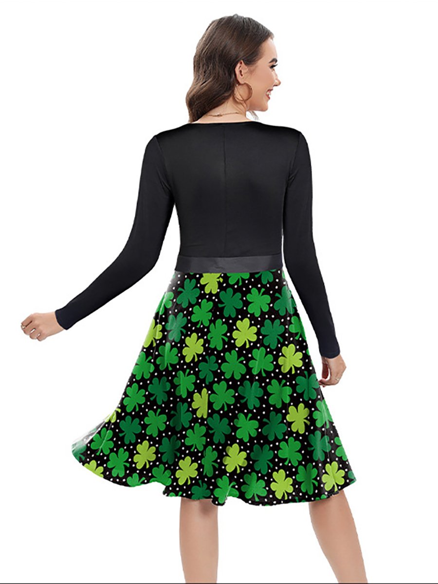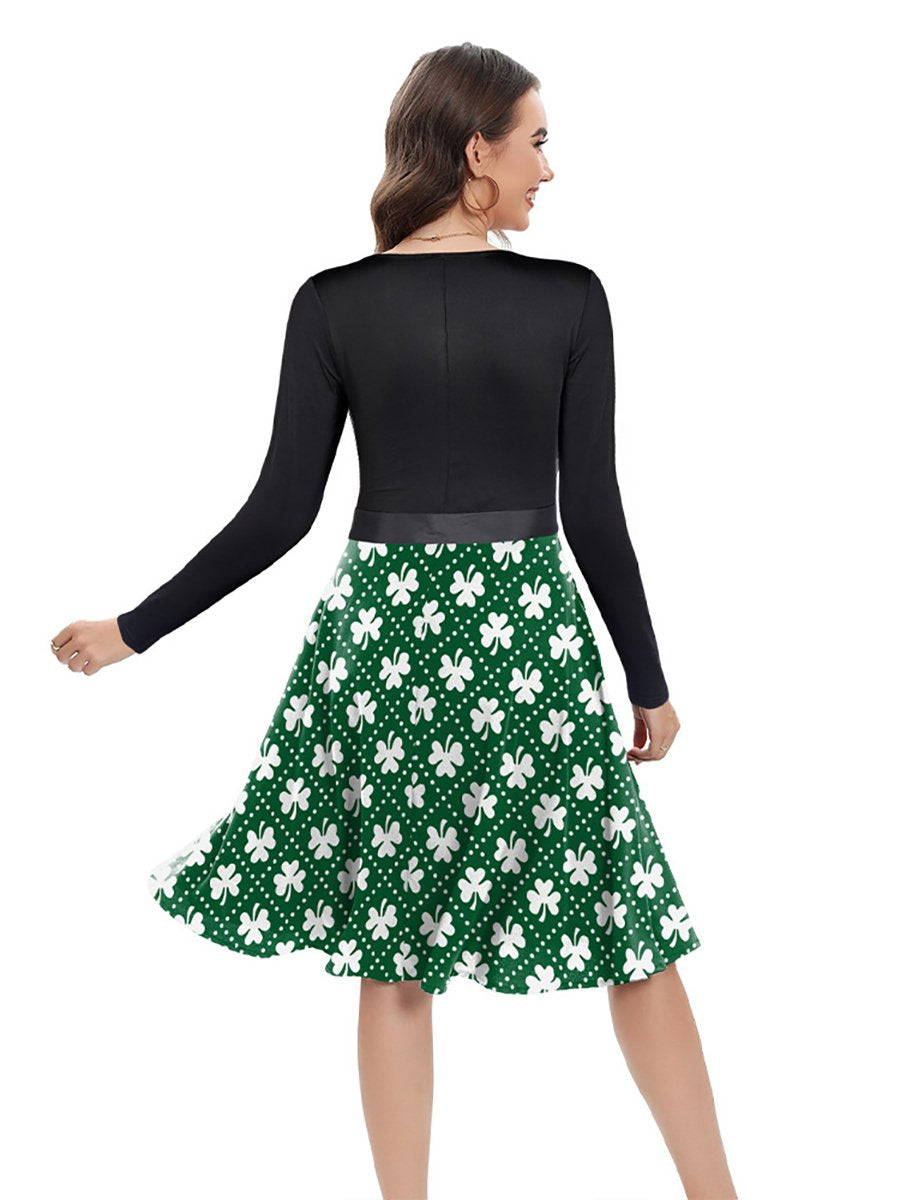 Design: Saint Patrick's Day costume?features a black and green midi dress, long sleeves, back zipper up closure, and three-leaved plant?print, this is a cute and sexy costume designed to make you look more charming.