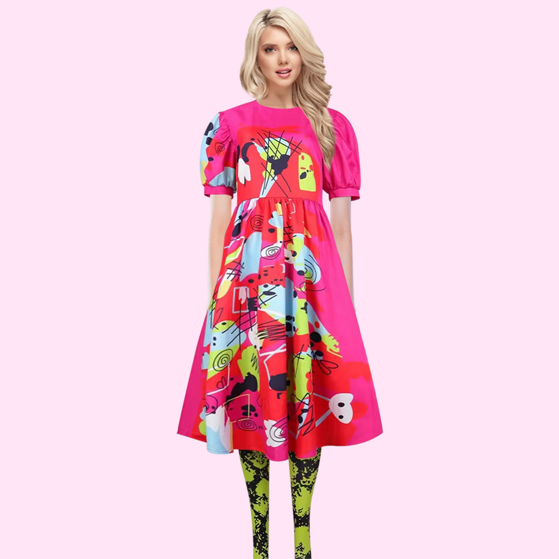 Design:?This?Plus Size Weird?Girl Hot Pink Dress?features?a modern, figure-hugging silhouette that accentuates the wearer's curves,?mckinnon rose red printed, short puff sleeve, back zipper up closure, 2 layers mesh hemline,?It's the perfect look for any occasion, with its eye-catching design that's sure to turn heads.