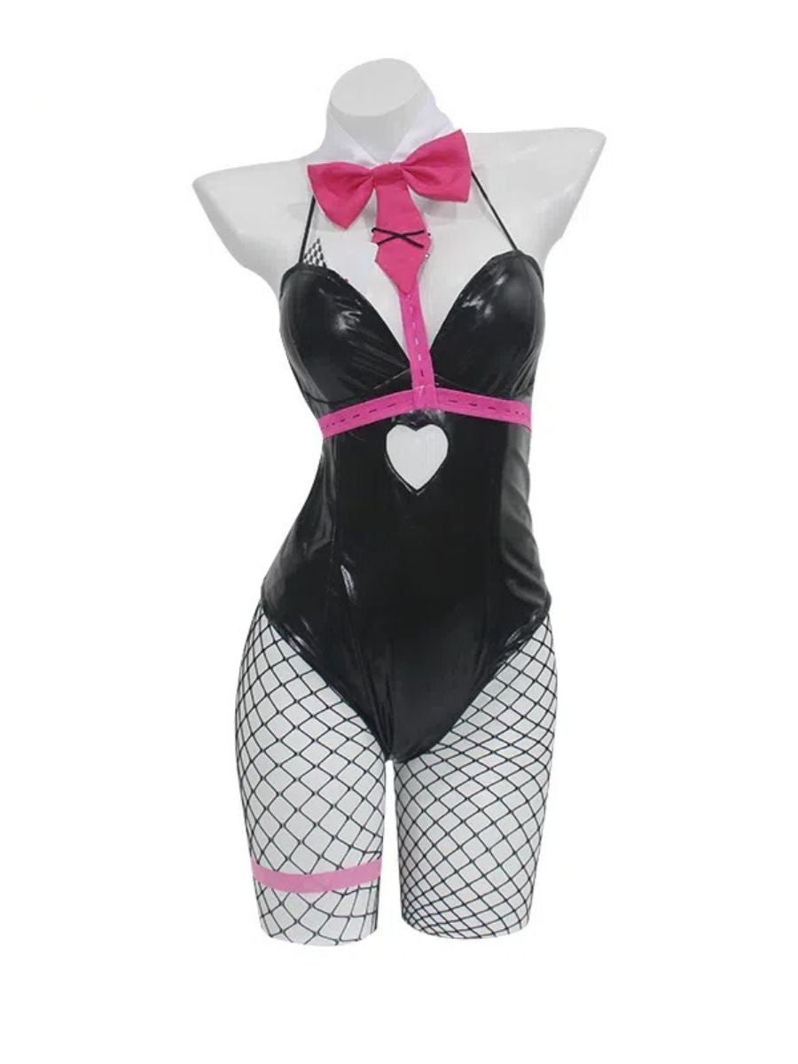 Design: Japanese Anime Cosplay Costume?inspired by anthropomorphic idol character, featuring a shiny faux leather bodysuit with a heart cutout and bold pink bow tie, halter neckline and criss-cross front detail offer an adjustable and supportive fit while enhancing your curves. Stand out from the crowd and embody your favorite character with this stunning cosplay costume.