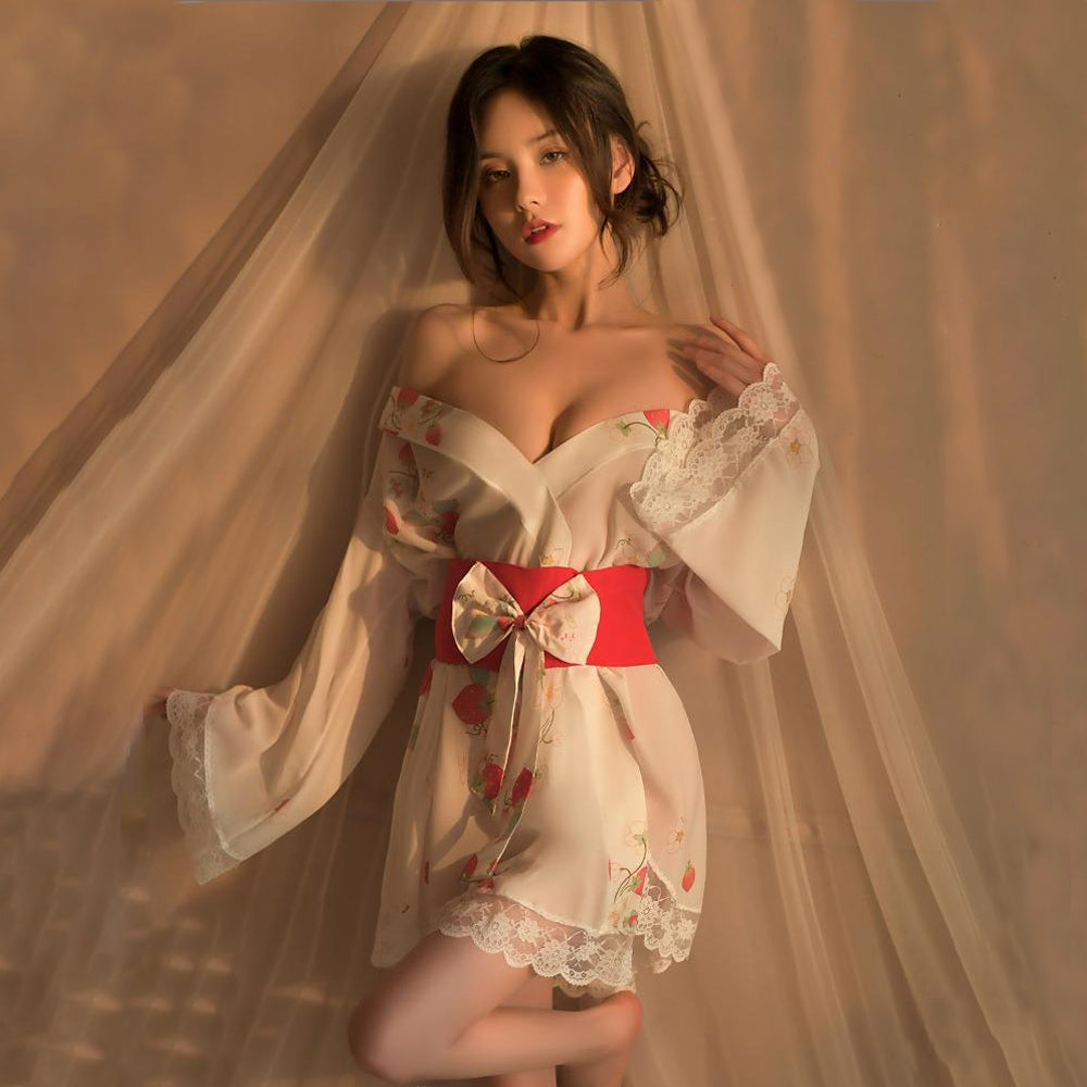 Design: sexy japanese cosplay lingerie?is semi-transparent but still offers some coverage. Show off your curves and figure while staying comfortable. Wrap around gorgeous Japanese kimono belt (obi) with?velcro?for a snatched waist. Kimono with wide sleeves, lace trimming and a cute bow at the front. This cute strawberry print on this women's kimono pajamas adds interest to your life and makes you look younger and sexier.