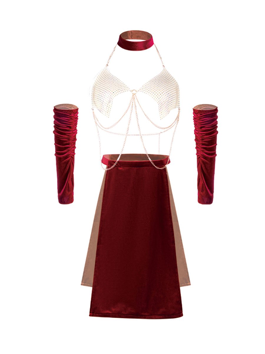 Design:?Sexy Chinese Style Lingerie Set is designed with black sheer sleeveless bodystocking with open crotch design, making it both sexy and practical. A sultry gold chain bra top, a burgundy velvet draping skirt, and a matching fingerless gloves. With this outfit, you'll feel confident and alluring, no matter the occasion.