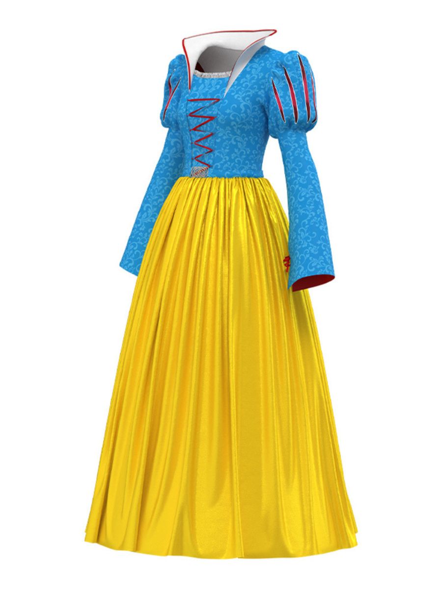 Design: Sexy Snow Princess Costume?featuring a blue and yellow long dress, the bodice is adorned with delicate floral patterns, red ribbon lace-up detailing, and puffed sleeves with red accents, the flowing yellow skirt adds a royal touch, making it perfect for costume parties.