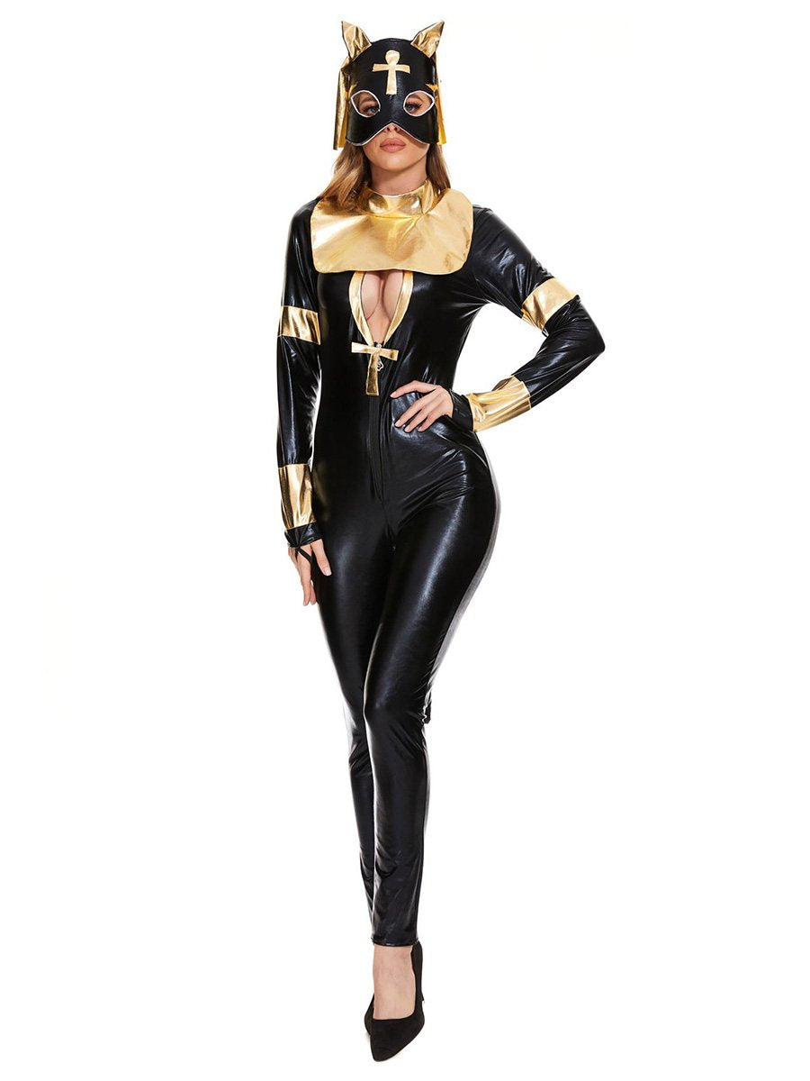 Design: Sexy Cat Women Leather Jumpsuit featuring a black vinyl full body jumpsuit, with a plunging neckline, long sleeves, an attached long tail, a face mask with cat ears, and a matching metallic gold collar. The perfect choice for your next event, this outfit will make heads turn and is sure to be a hit.