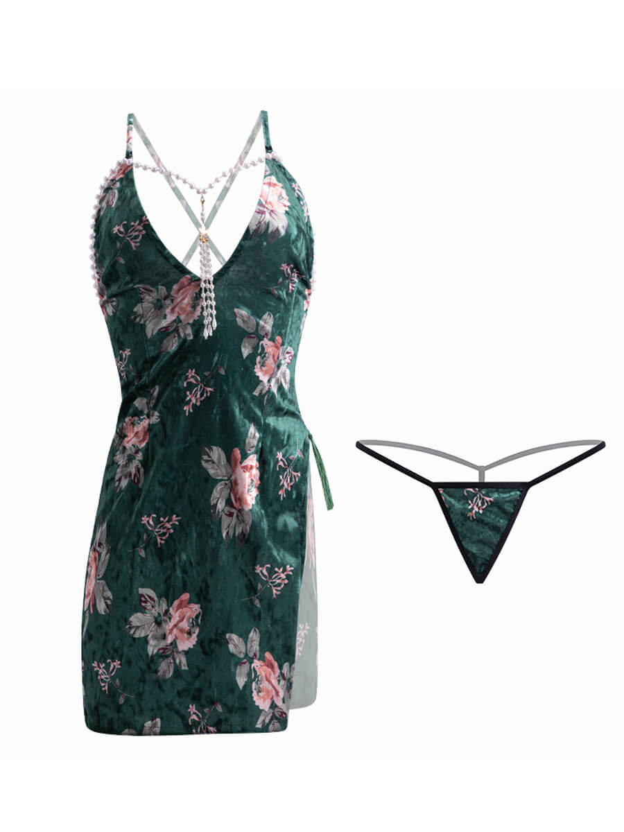 Design:?Sexy Chinese Cheongsam?Lingerie is designed with velvet mini dress, adjustable spaghetti straps and back criss-cross design, pearl chain accents, traditional chinese collar with a keyhole, an allover floral printed, and high slit hemline. No restraints on chest with narrow bralette design, and the mini dress are definitely fit on your body curves outline. It makes you more attractive, charming, fashion and chic.
