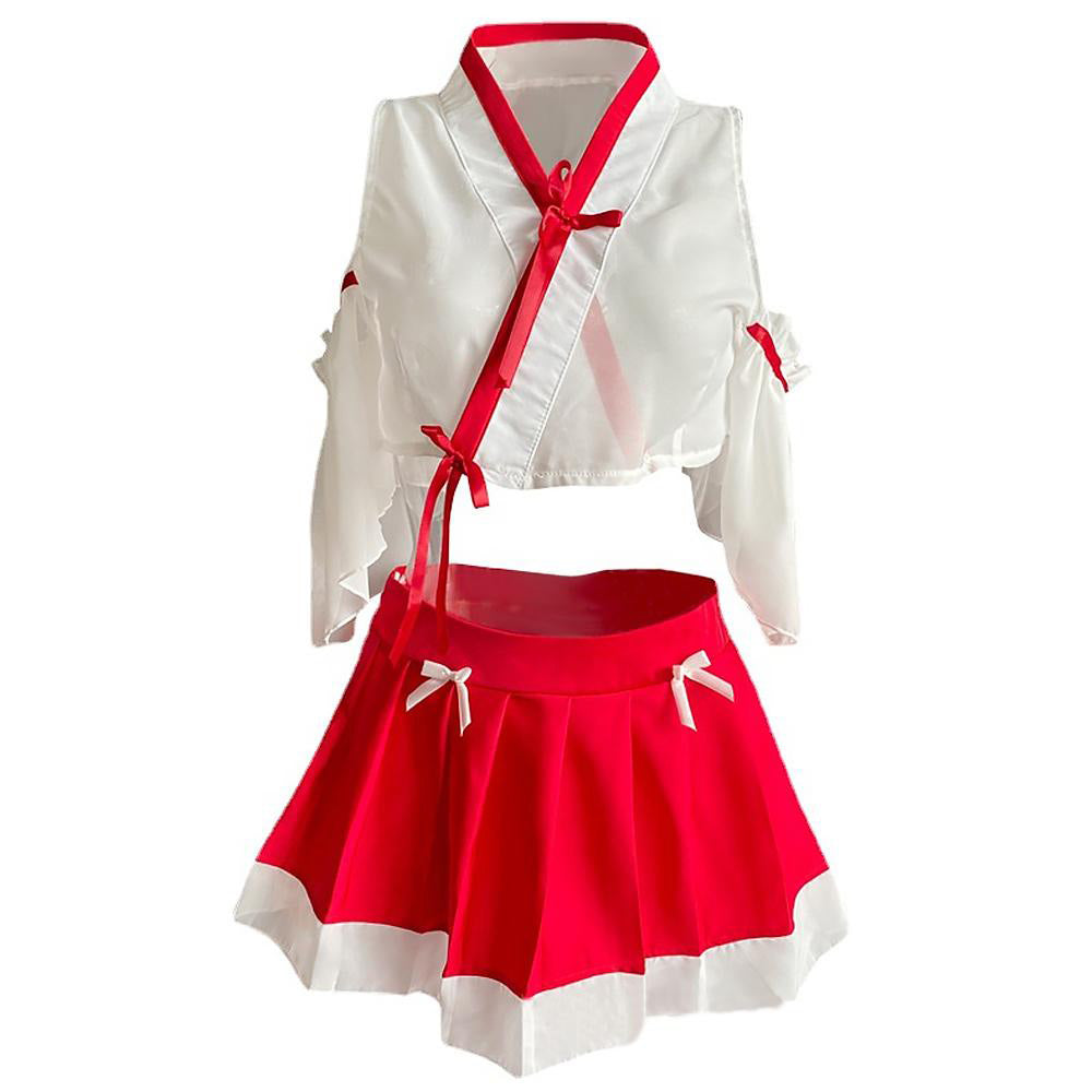 Design: The pleated skirt and white Kimono?has been traditional for the Shrine Maiden. White kimono top with the red detailing features cold shoulder, half flared sleeve, all-over sheer lace is tantalizing to your partner. Mini skirt featuring cute bowknot and white hemline, will make you sexy, cute and attractive;