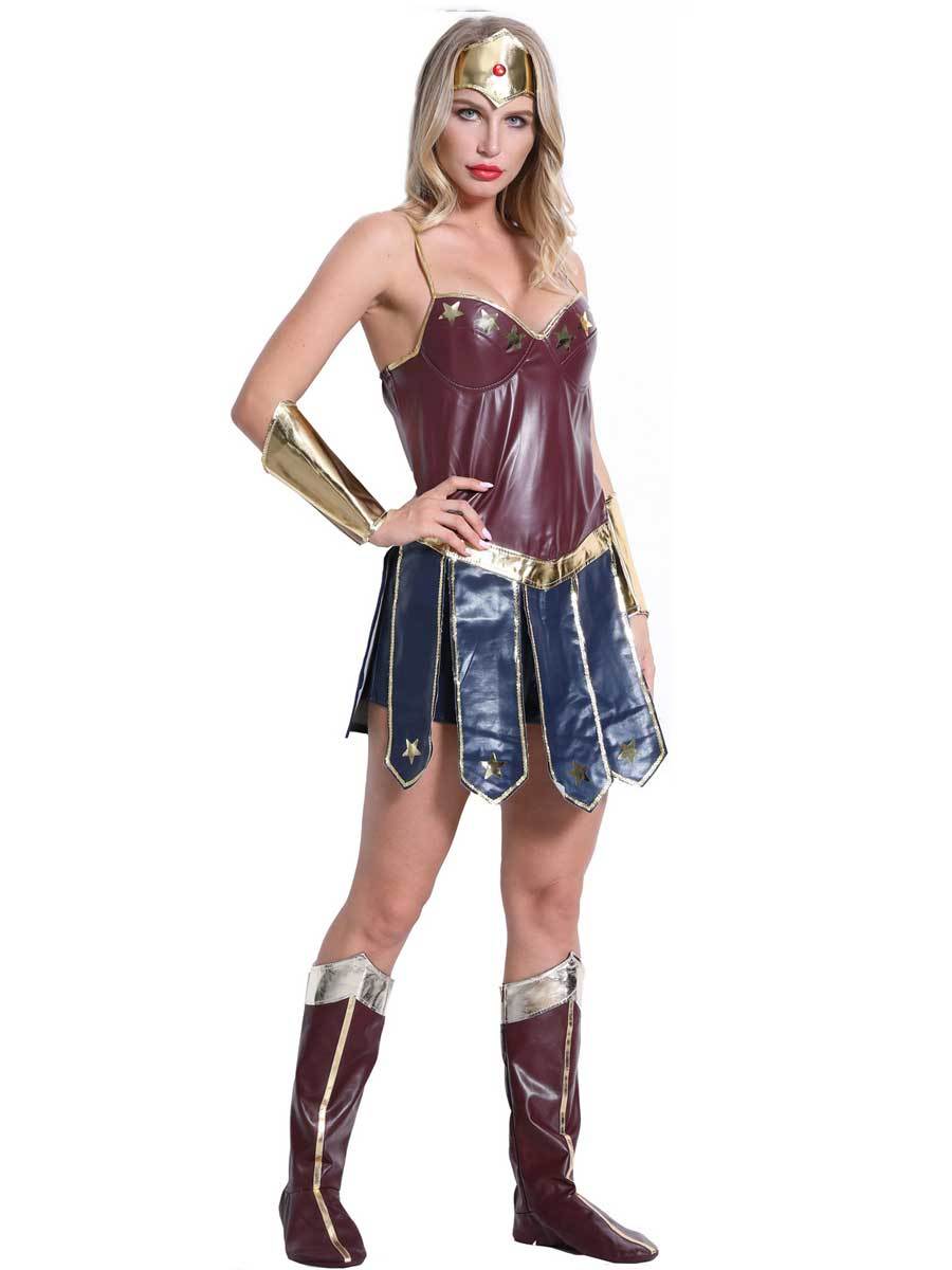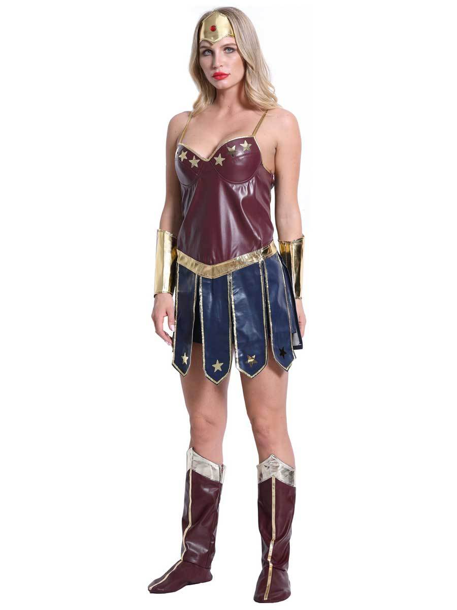 Design: Sexy Wonder Lady Costume inspired by live-action flim character, featuring a wet look mini dress,?adjustable spaghetti straps, back zipper up closure, and matching gold fingerless gloves. Stand out from the crowd and embody your favorite character with this stunning cosplay costume.