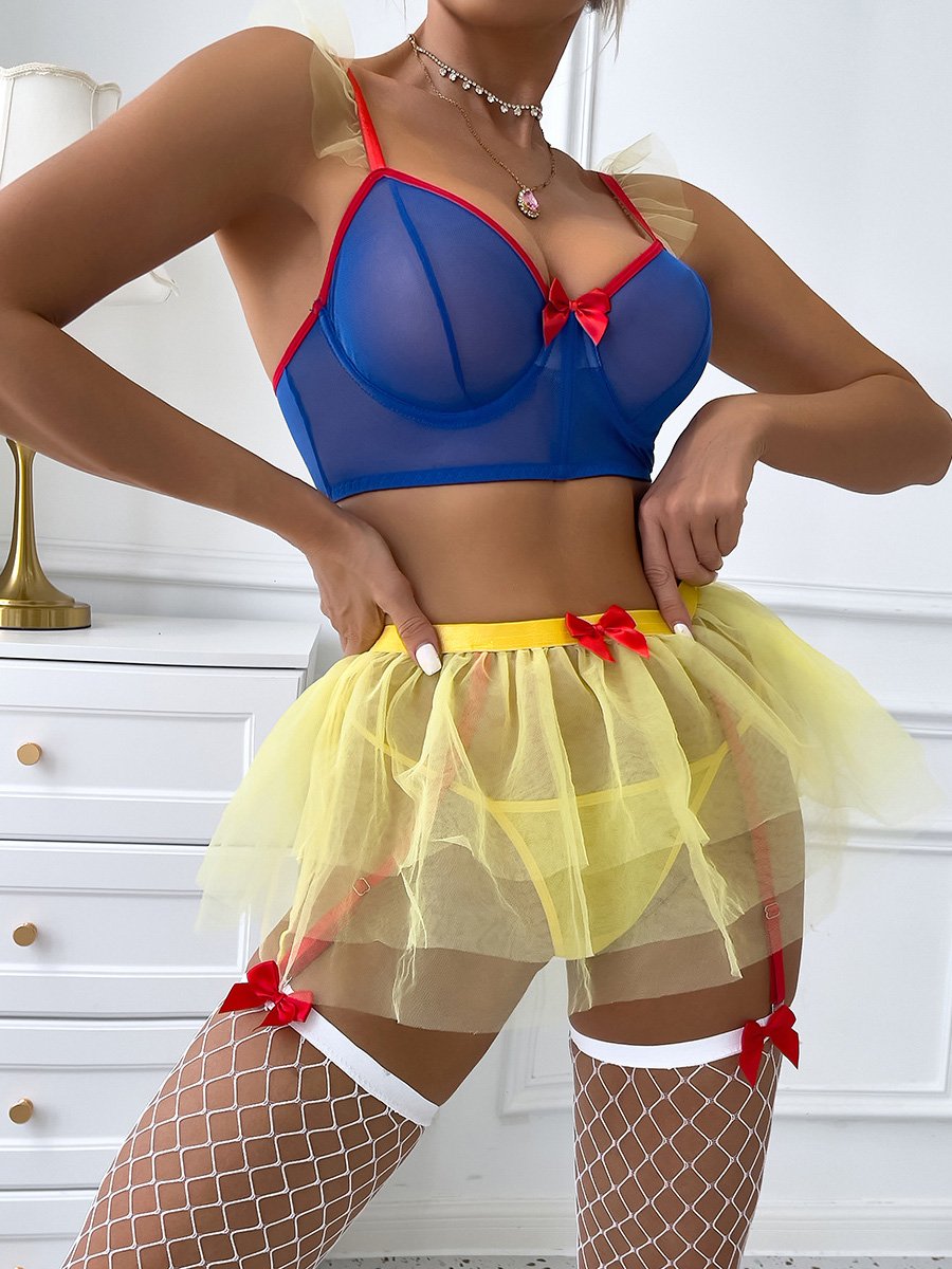 Design: Sexy Anime Cosplay Costume featuring a blue mesh bra top, adjustable spaghetti straps with mesh trim, a back hook and eye closure, a yellowe mesh mini skirt, adjustable garter straps, and a matching panty, bring your fantasy to life in this princess cosplay costume inspired by your favorite characters!