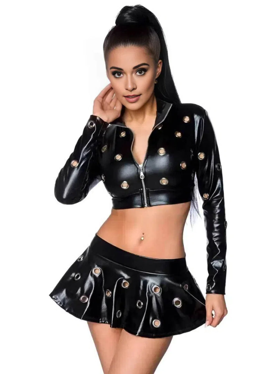 Design: This wet look nightclub costume featuring a long sleeve crop top with a zip up front, an allover silver grommet accents, ?and matching mini skrit, and T thong. Prepare to stand out and make a statement with this striking outfit.